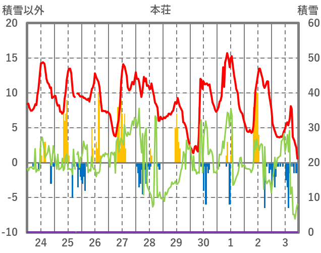 | 日 | 時 | 気温 | 降水 | 風向/風速 | 日照 | 積雪 | 降雪 |