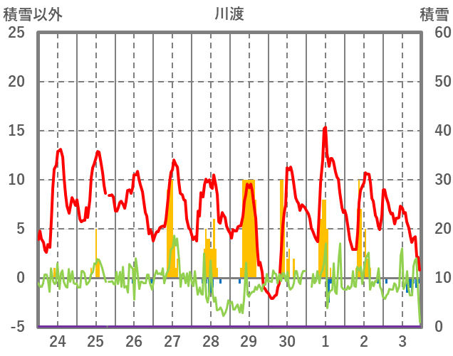 | 日 | 時 | 気温 | 降水 | 風向/風速 | 日照 | 積雪 | 降雪 |