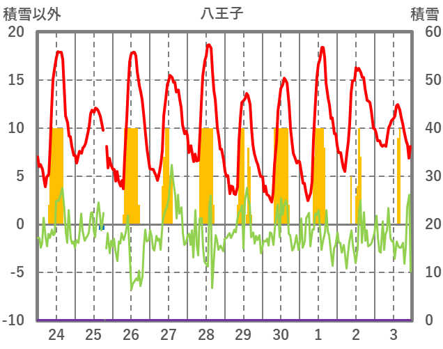 | 日 | 時 | 気温 | 降水 | 風向/風速 | 日照 | 積雪 | 降雪 |