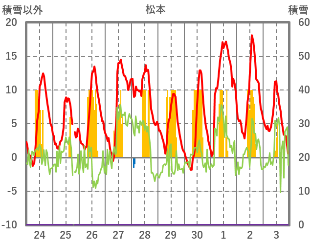 | 日 | 時 | 気温 | 降水 | 風向/風速 | 日照 | 積雪 | 降雪 |
