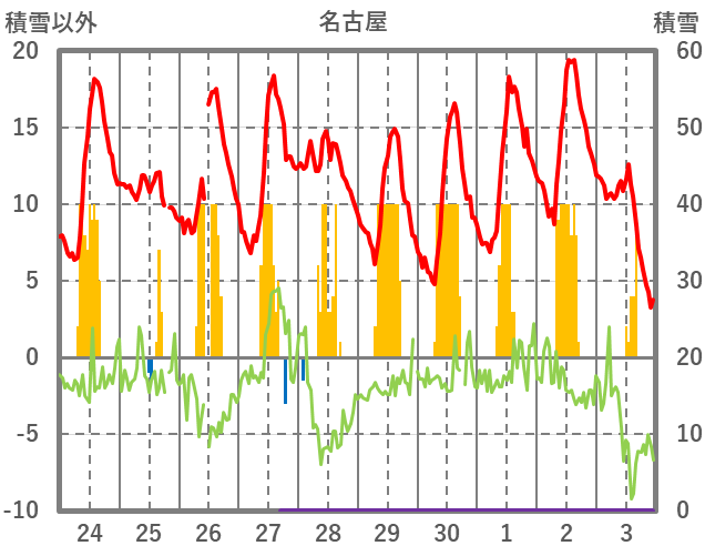 | 日 | 時 | 気温 | 降水 | 風向/風速 | 日照 | 積雪 | 降雪 |