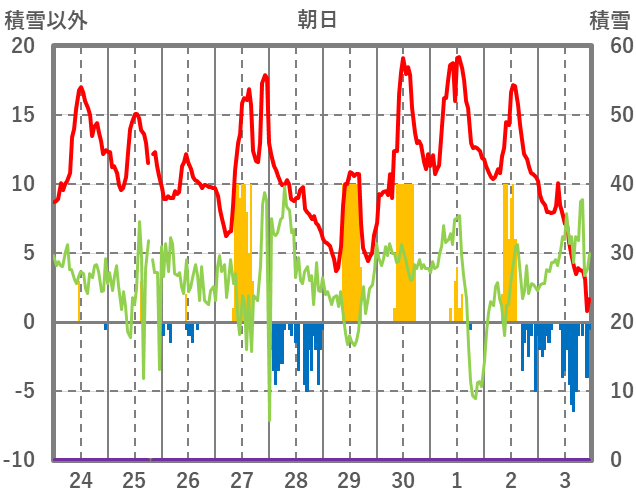 | 日 | 時 | 気温 | 降水 | 風向/風速 | 日照 | 積雪 | 降雪 |