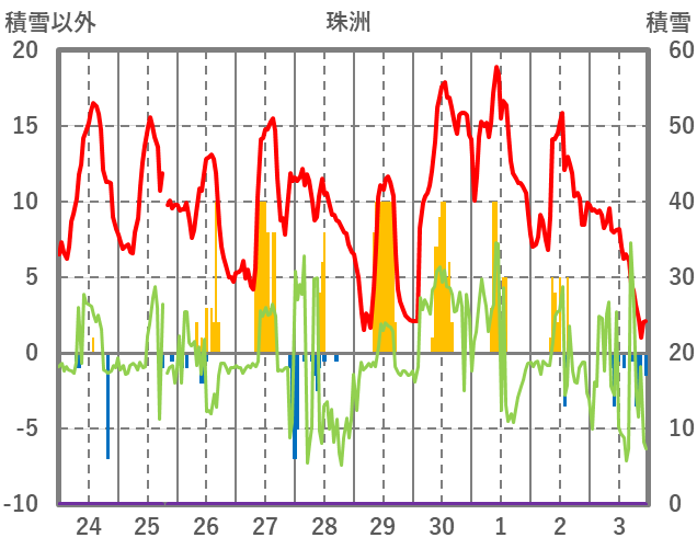 | 日 | 時 | 気温 | 降水 | 風向/風速 | 日照 | 積雪 | 降雪 |