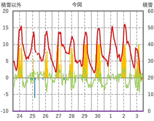 | 日 | 時 | 気温 | 降水 | 風向/風速 | 日照 | 積雪 | 降雪 |