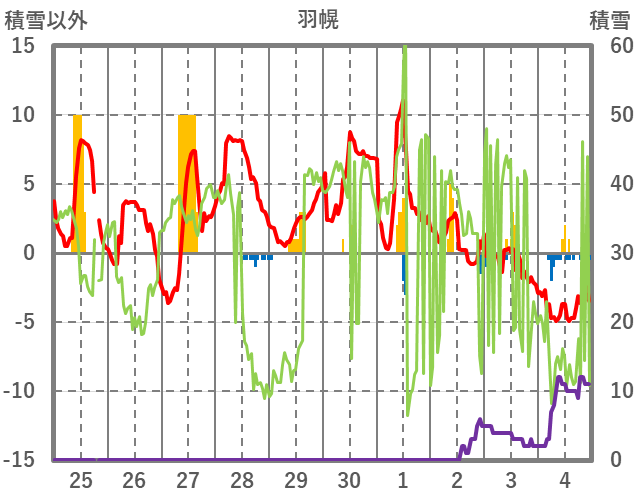| 日 | 時 | 気温 | 降水 | 風向/風速 | 日照 | 積雪 | 降雪 |