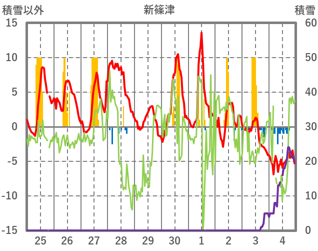 | 日 | 時 | 気温 | 降水 | 風向/風速 | 日照 | 積雪 | 降雪 |