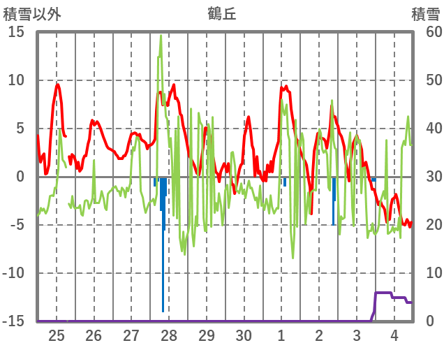 | 日 | 時 | 気温 | 降水 | 風向/風速 | 日照 | 積雪 | 降雪 |