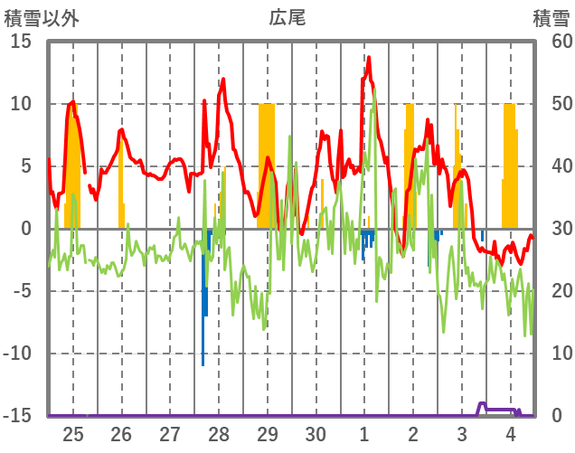| 日 | 時 | 気温 | 降水 | 風向/風速 | 日照 | 積雪 | 降雪 |