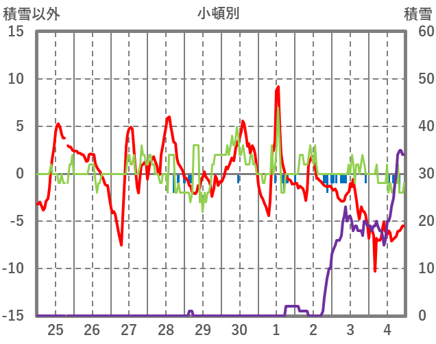 | 日 | 時 | 気温 | 降水 | 風向/風速 | 日照 | 積雪 | 降雪 |