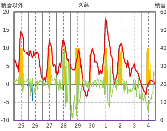 | 日 | 時 | 気温 | 降水 | 風向/風速 | 日照 | 積雪 | 降雪 |