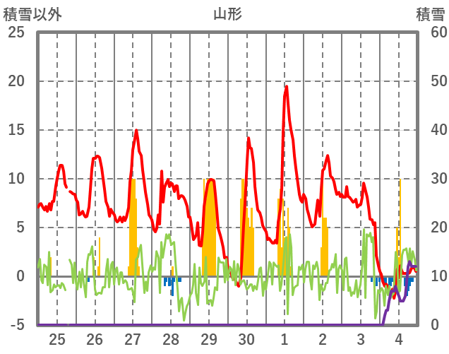 | 日 | 時 | 気温 | 降水 | 風向/風速 | 日照 | 積雪 | 降雪 |