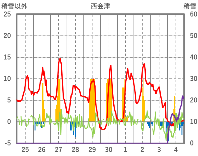 | 日 | 時 | 気温 | 降水 | 風向/風速 | 日照 | 積雪 | 降雪 |