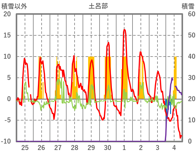 | 日 | 時 | 気温 | 降水 | 風向/風速 | 日照 | 積雪 | 降雪 |