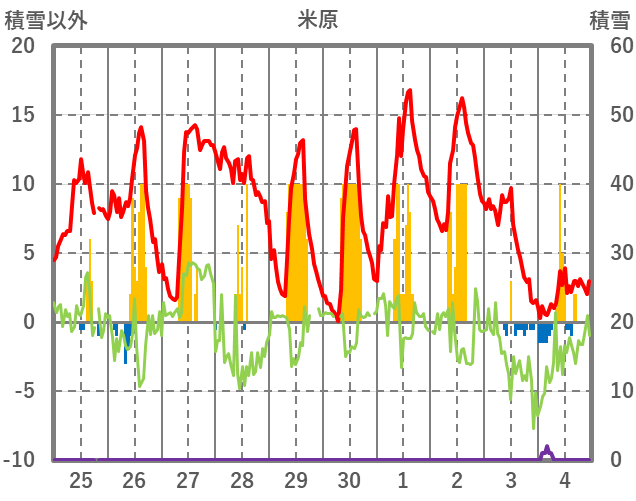 | 日 | 時 | 気温 | 降水 | 風向/風速 | 日照 | 積雪 | 降雪 |
