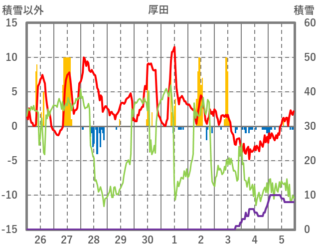 | 日 | 時 | 気温 | 降水 | 風向/風速 | 日照 | 積雪 | 降雪 |