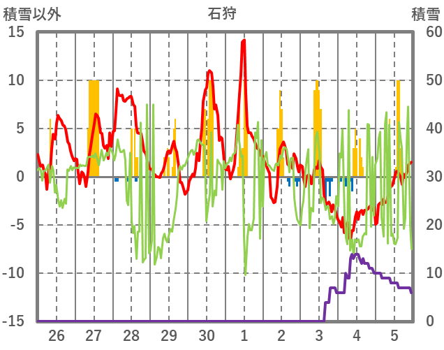 | 日 | 時 | 気温 | 降水 | 風向/風速 | 日照 | 積雪 | 降雪 |