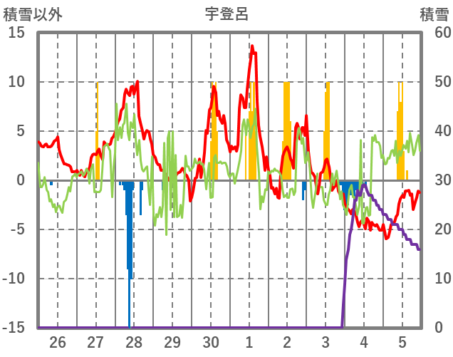 | 日 | 時 | 気温 | 降水 | 風向/風速 | 日照 | 積雪 | 降雪 |