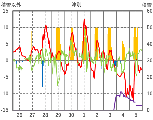 | 日 | 時 | 気温 | 降水 | 風向/風速 | 日照 | 積雪 | 降雪 |