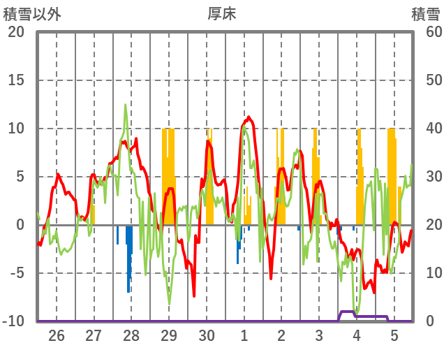 | 日 | 時 | 気温 | 降水 | 風向/風速 | 日照 | 積雪 | 降雪 |