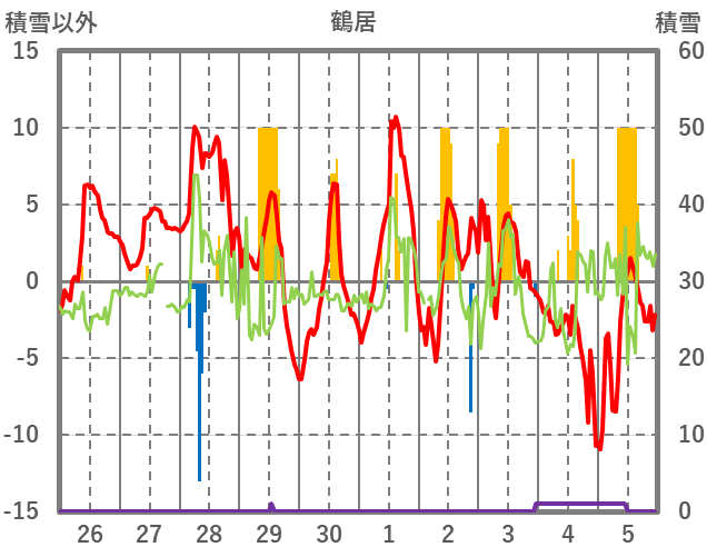 | 日 | 時 | 気温 | 降水 | 風向/風速 | 日照 | 積雪 | 降雪 |