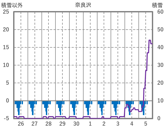 | 日 | 時 | 気温 | 降水 | 風向/風速 | 日照 | 積雪 | 降雪 |
