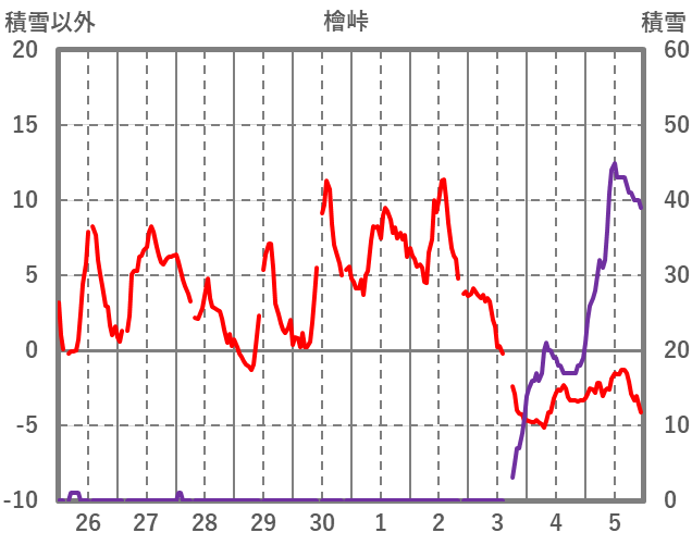 | 日 | 時 | 気温 | 降水 | 風向/風速 | 日照 | 積雪 | 降雪 |