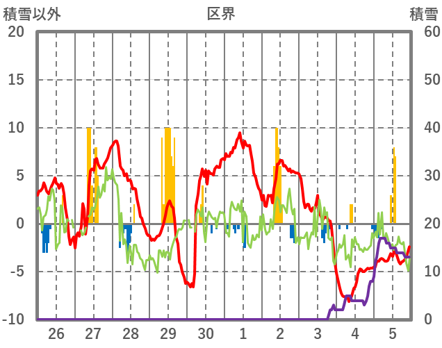 | 日 | 時 | 気温 | 降水 | 風向/風速 | 日照 | 積雪 | 降雪 |