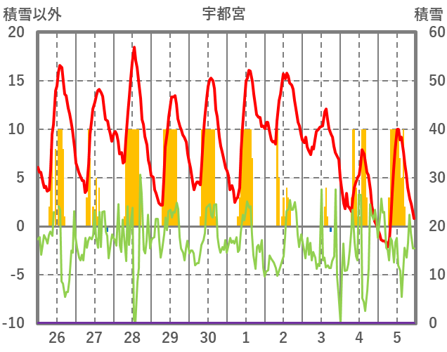 | 日 | 時 | 気温 | 降水 | 風向/風速 | 日照 | 積雪 | 降雪 |