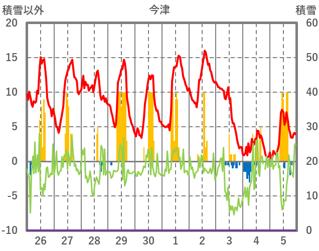 | 日 | 時 | 気温 | 降水 | 風向/風速 | 日照 | 積雪 | 降雪 |