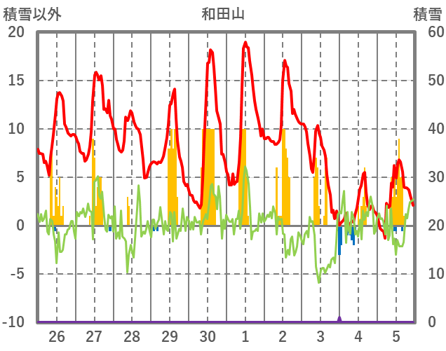 | 日 | 時 | 気温 | 降水 | 風向/風速 | 日照 | 積雪 | 降雪 |