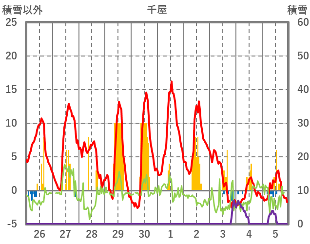 | 日 | 時 | 気温 | 降水 | 風向/風速 | 日照 | 積雪 | 降雪 |