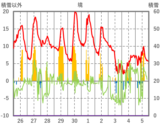 | 日 | 時 | 気温 | 降水 | 風向/風速 | 日照 | 積雪 | 降雪 |