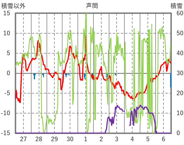 | 日 | 時 | 気温 | 降水 | 風向/風速 | 日照 | 積雪 | 降雪 |