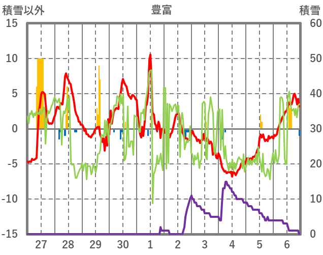 | 日 | 時 | 気温 | 降水 | 風向/風速 | 日照 | 積雪 | 降雪 |
