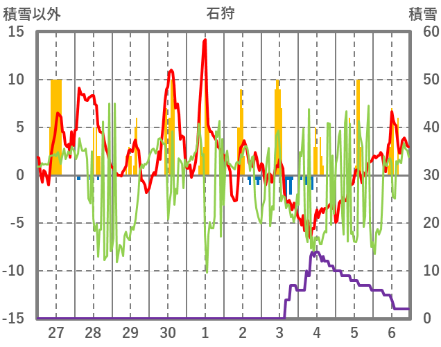 | 日 | 時 | 気温 | 降水 | 風向/風速 | 日照 | 積雪 | 降雪 |