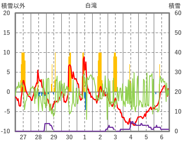 | 日 | 時 | 気温 | 降水 | 風向/風速 | 日照 | 積雪 | 降雪 |