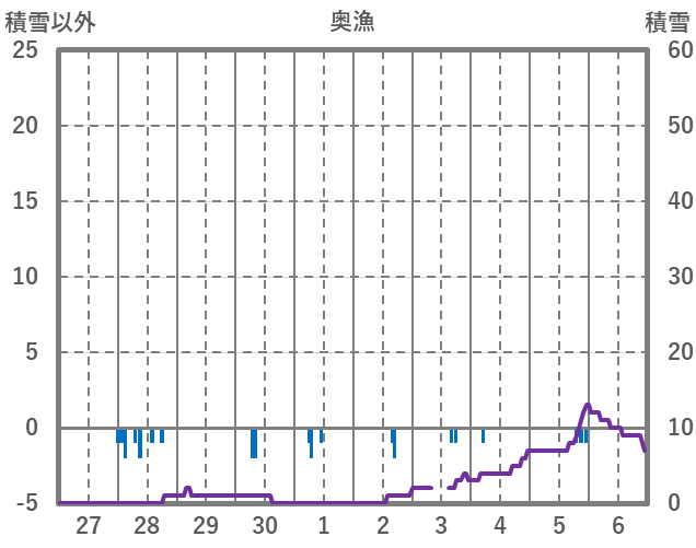 | 日 | 時 | 気温 | 降水 | 風向/風速 | 日照 | 積雪 | 降雪 |