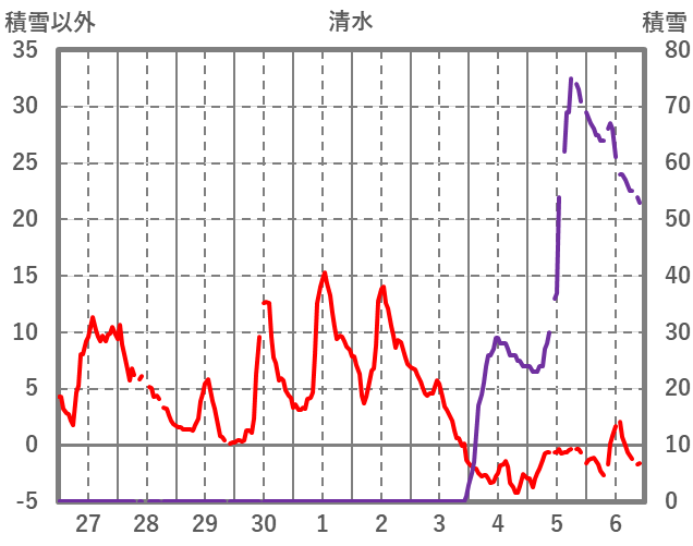 | 日 | 時 | 気温 | 降水 | 風向/風速 | 日照 | 積雪 | 降雪 |