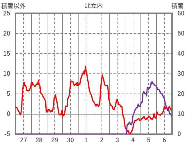 | 日 | 時 | 気温 | 降水 | 風向/風速 | 日照 | 積雪 | 降雪 |