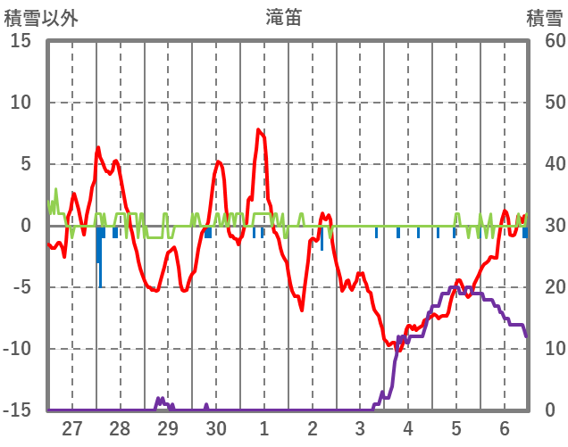 | 日 | 時 | 気温 | 降水 | 風向/風速 | 日照 | 積雪 | 降雪 |
