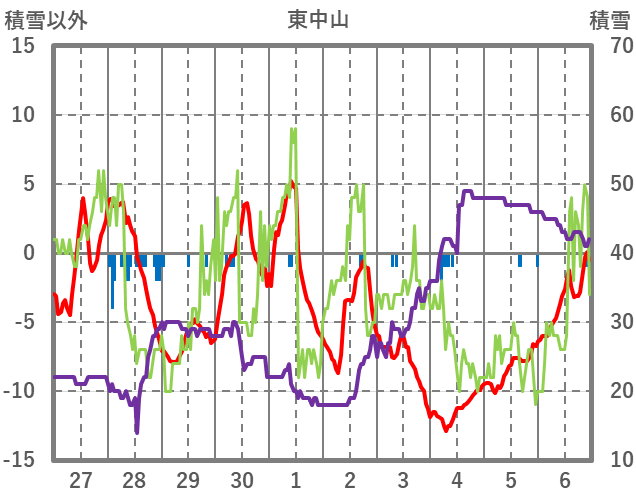 | 日 | 時 | 気温 | 降水 | 風向/風速 | 日照 | 積雪 | 降雪 |