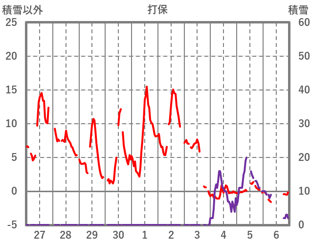 | 日 | 時 | 気温 | 降水 | 風向/風速 | 日照 | 積雪 | 降雪 |