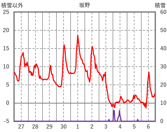 | 日 | 時 | 気温 | 降水 | 風向/風速 | 日照 | 積雪 | 降雪 |
