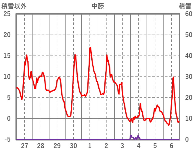 | 日 | 時 | 気温 | 降水 | 風向/風速 | 日照 | 積雪 | 降雪 |