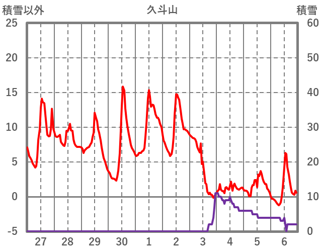 | 日 | 時 | 気温 | 降水 | 風向/風速 | 日照 | 積雪 | 降雪 |