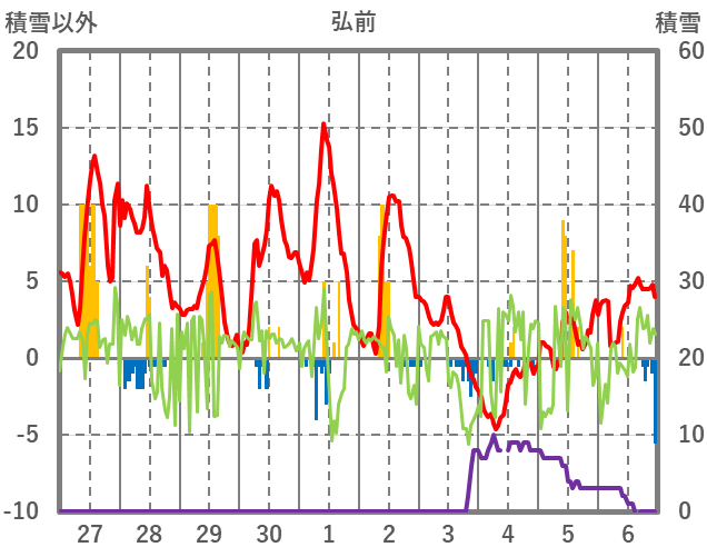 | 日 | 時 | 気温 | 降水 | 風向/風速 | 日照 | 積雪 | 降雪 |