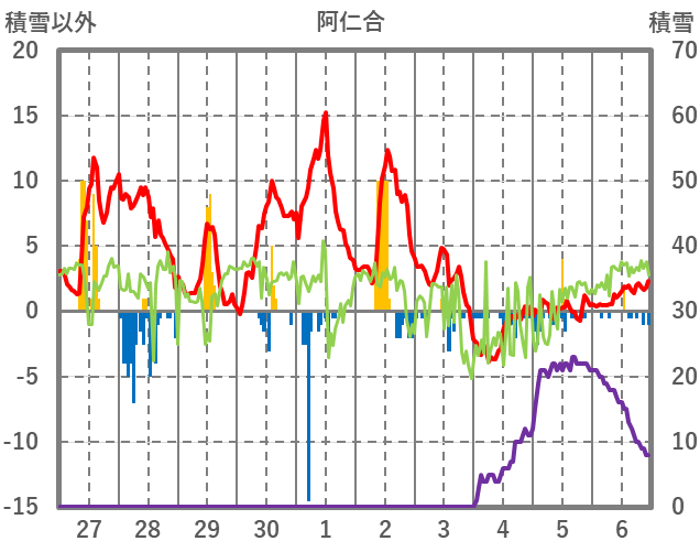 | 日 | 時 | 気温 | 降水 | 風向/風速 | 日照 | 積雪 | 降雪 |