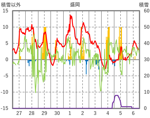 | 日 | 時 | 気温 | 降水 | 風向/風速 | 日照 | 積雪 | 降雪 |
