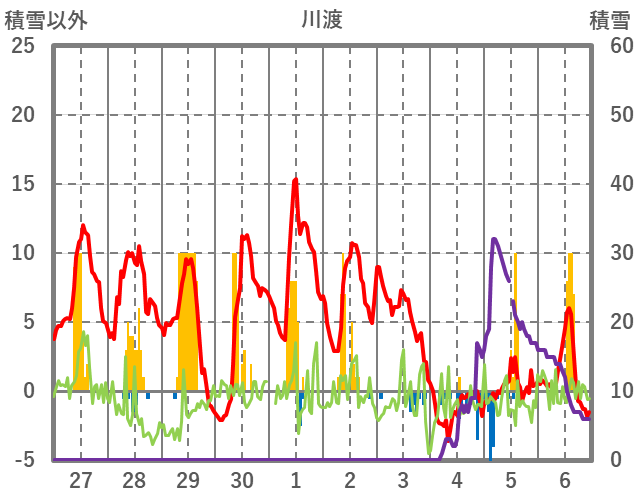 | 日 | 時 | 気温 | 降水 | 風向/風速 | 日照 | 積雪 | 降雪 |