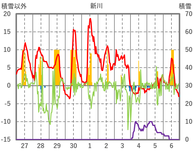 | 日 | 時 | 気温 | 降水 | 風向/風速 | 日照 | 積雪 | 降雪 |